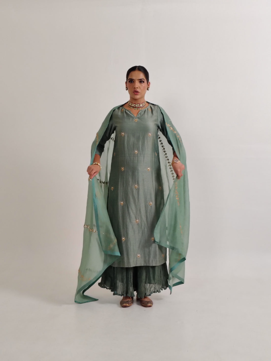 Sea Green Hand Embroidered A-Line Chanderi Kurta Set