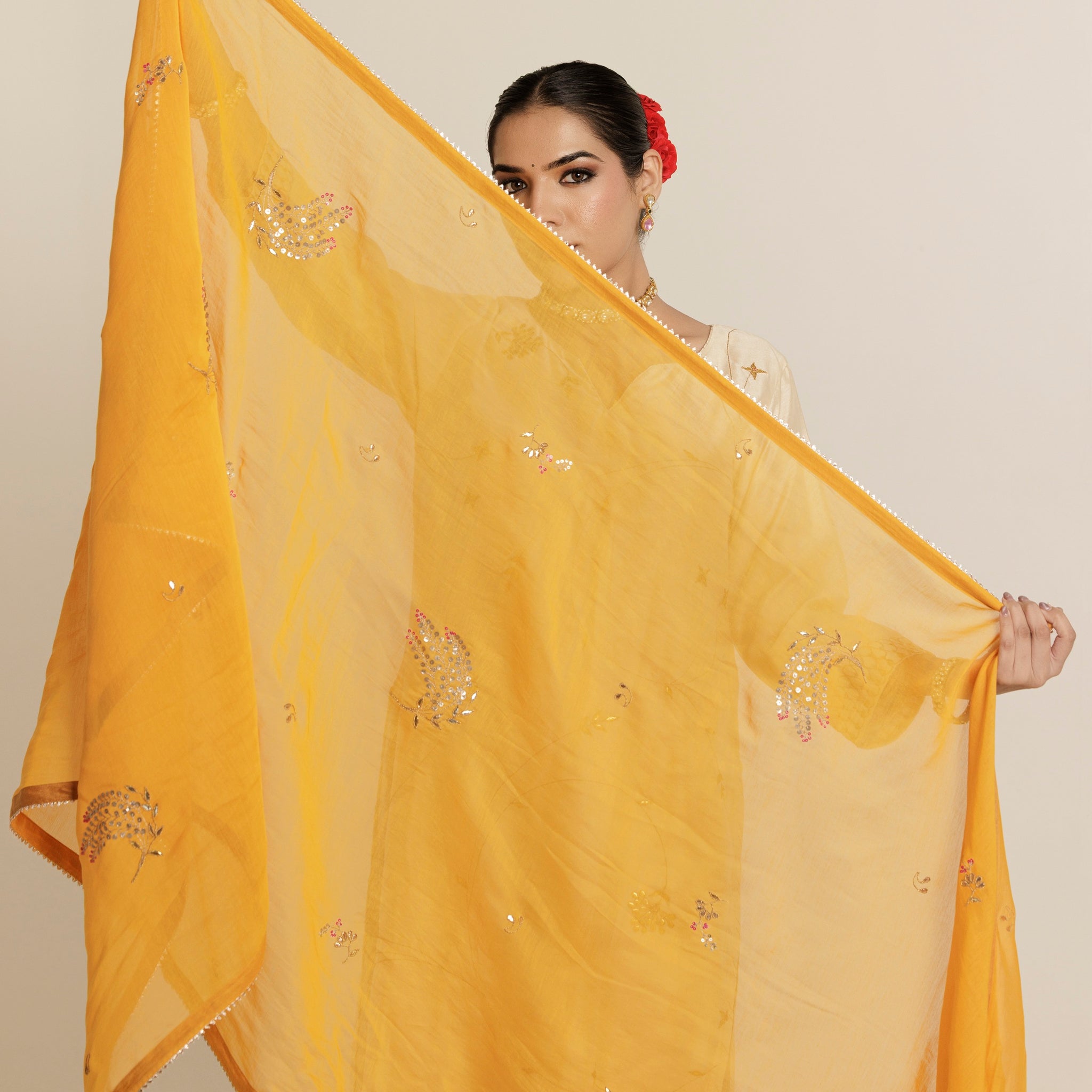 Hand Crafted cotton silk dupatta with delicate gold zari, sequins and gota-patti embroidery finished with accent colour facing. It has bit gota floral boota's all over., Wrap around this astounding piece and grace your favourite occasion. The beautiful and intricate gota-patti work showcases the precision and perfection with which the artisans have worked on this elegant beauty.
