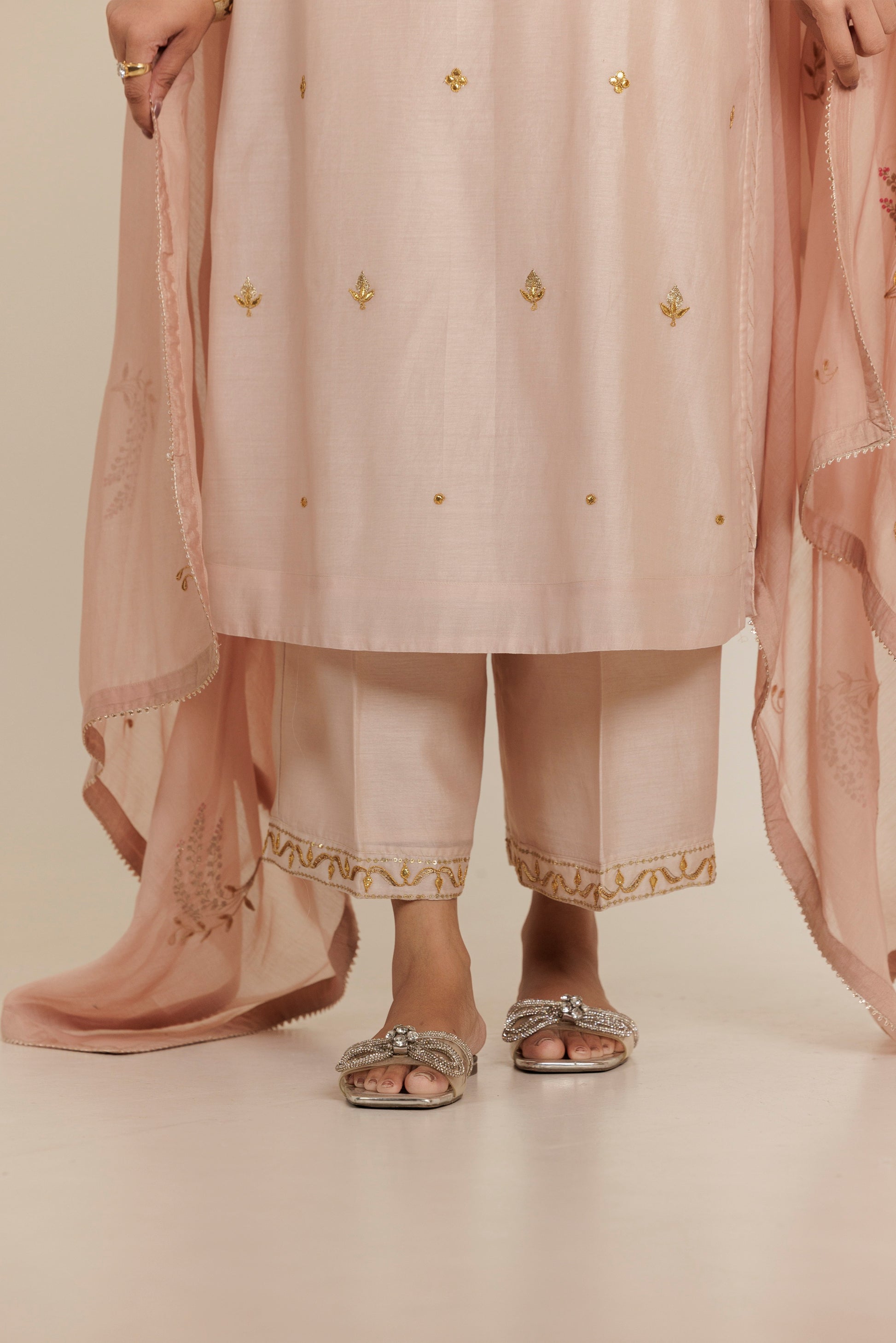 An Elegant Champagne Pink Kurta Set adorned with gota-patti detailing on kurta making it an ideal statement piece for the upcoming festivities. The subtle shimmer of the embroidery highlights the richness of the design, perfect for making a statement at any occasion.