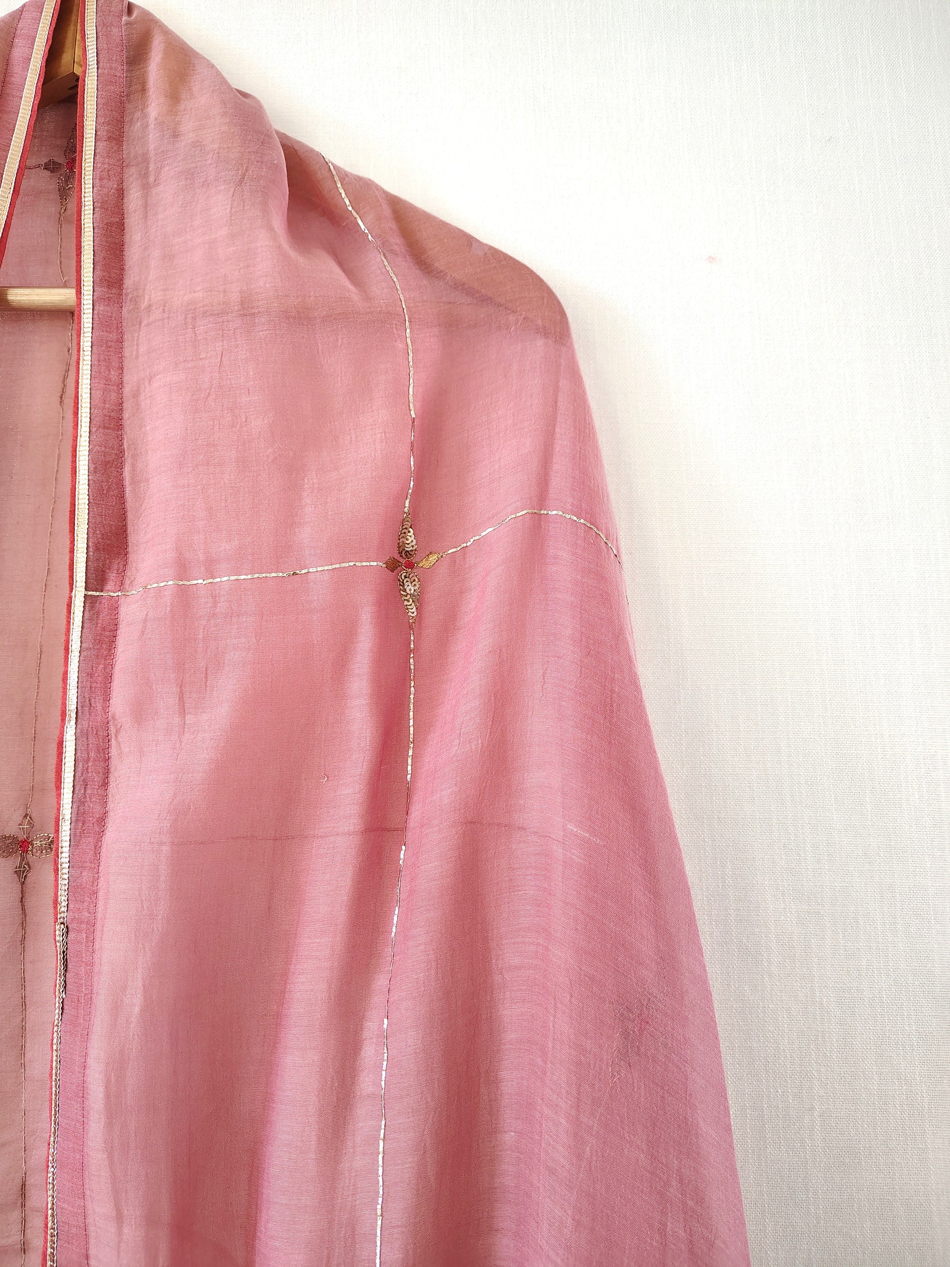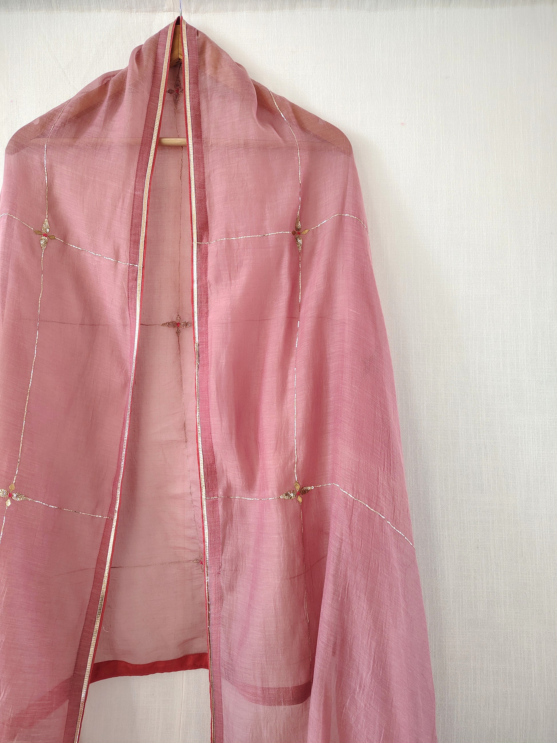 This pink cotton silk dupatta with delicate floral aari-zardozi embroidery, It has work all over. Wrap around this astounding piece and grace your favourite occasion. The beautiful and intricate work showcases the precision and perfection with which the artisans have worked on this elegant beauty.