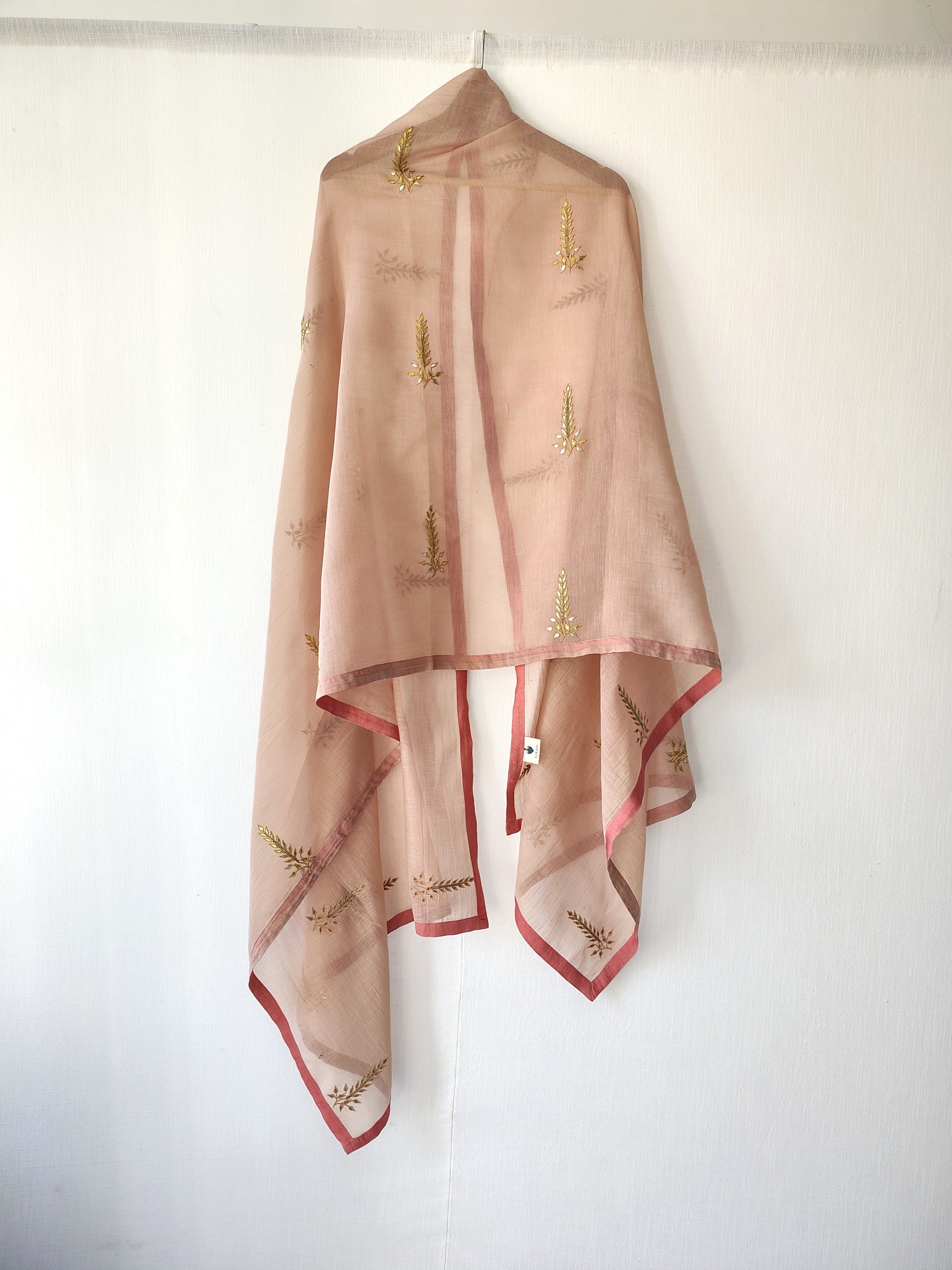 Hand Crafted cotton silk dupatta with delicate gold gota-patti,and zari embroidery finished with accent colour facing. It has gota floral boota's all over., Wrap around this astounding piece and grace your favourite occasion. The beautiful and intricate gota-patti work showcases the precision and perfection with which the artisans have worked on this elegant beauty.