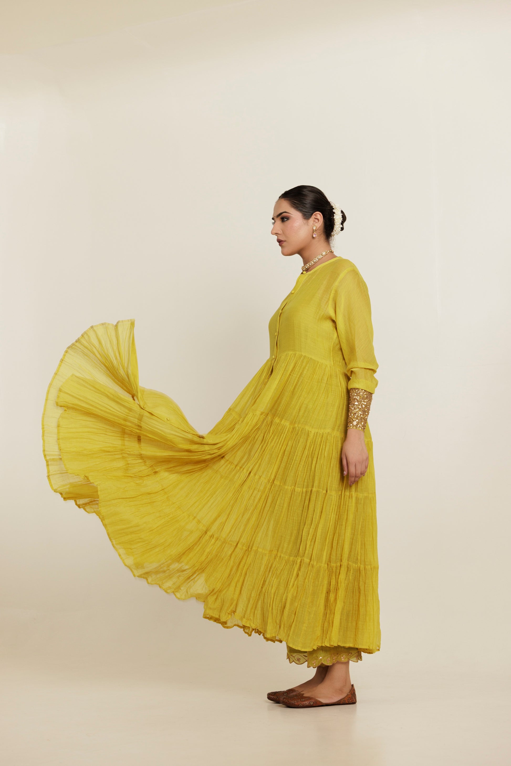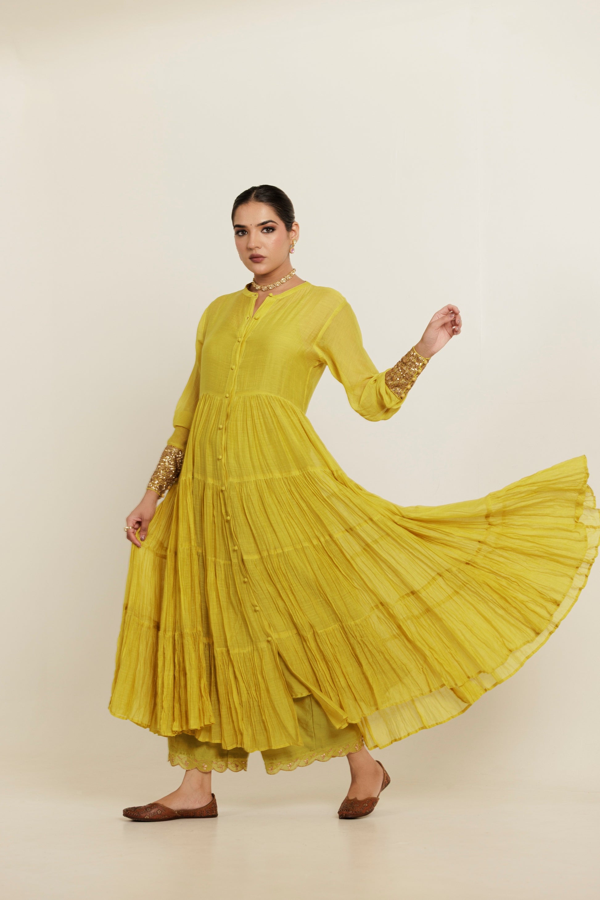 An Elegant Green Anarkali Long Flared Kurta Set features an empire-line kurta with sequined sleeves paired up with heavy aari-zari embroidered dupatta & pants. Soft front gathers add flow and elegance to the silhouette. The kurta comes with a separate inner for added comfort and coverage.