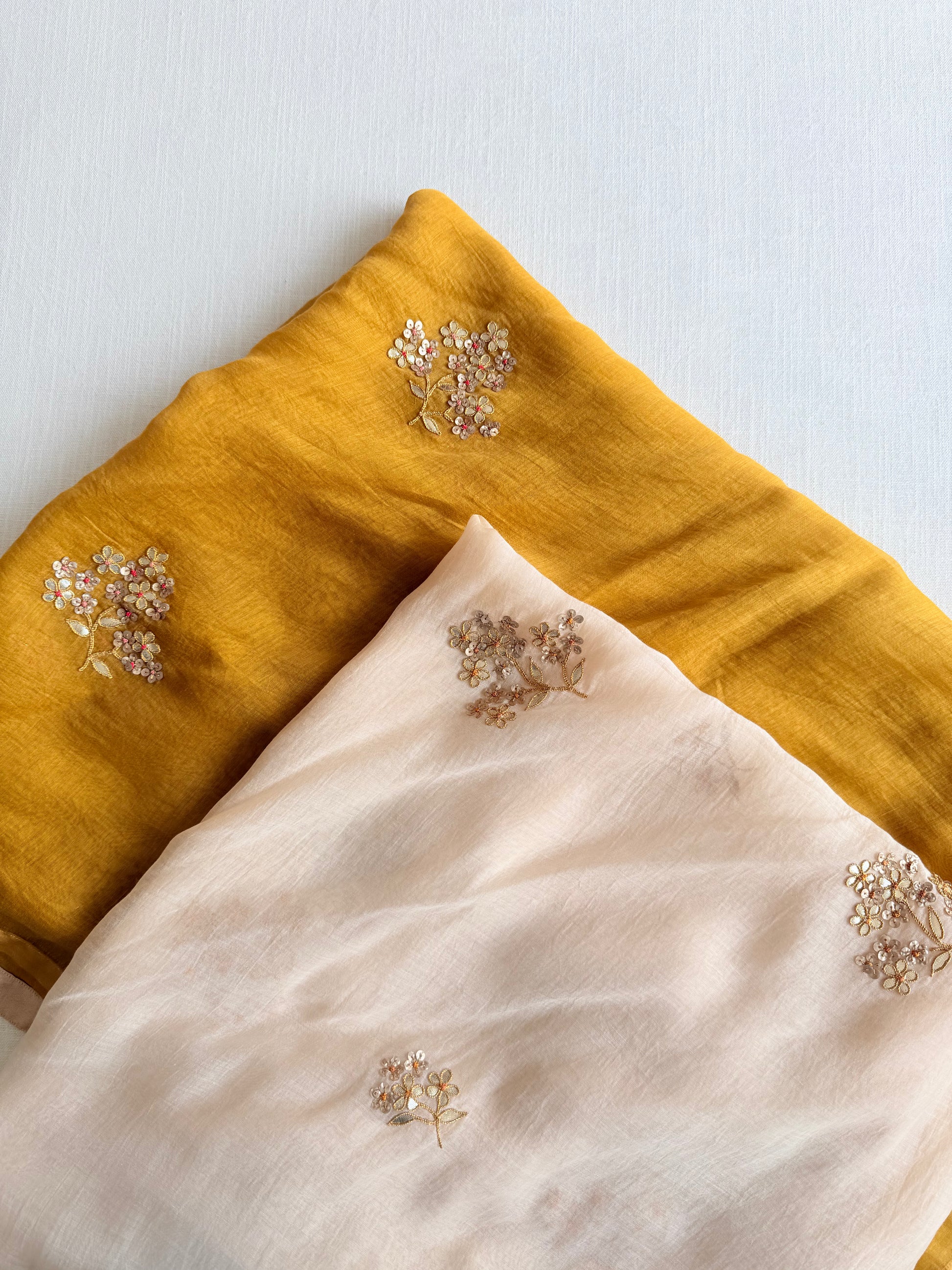 Hand Crafted cotton silk dupatta with delicate gold zari, sequins and gota-patti embroidery finished with accent colour facing. It has bit gota floral boota's all over., Wrap around this astounding piece and grace your favourite occasion. The beautiful and intricate gota-patti work showcases the precision and perfection with which the artisans have worked on this elegant beauty.