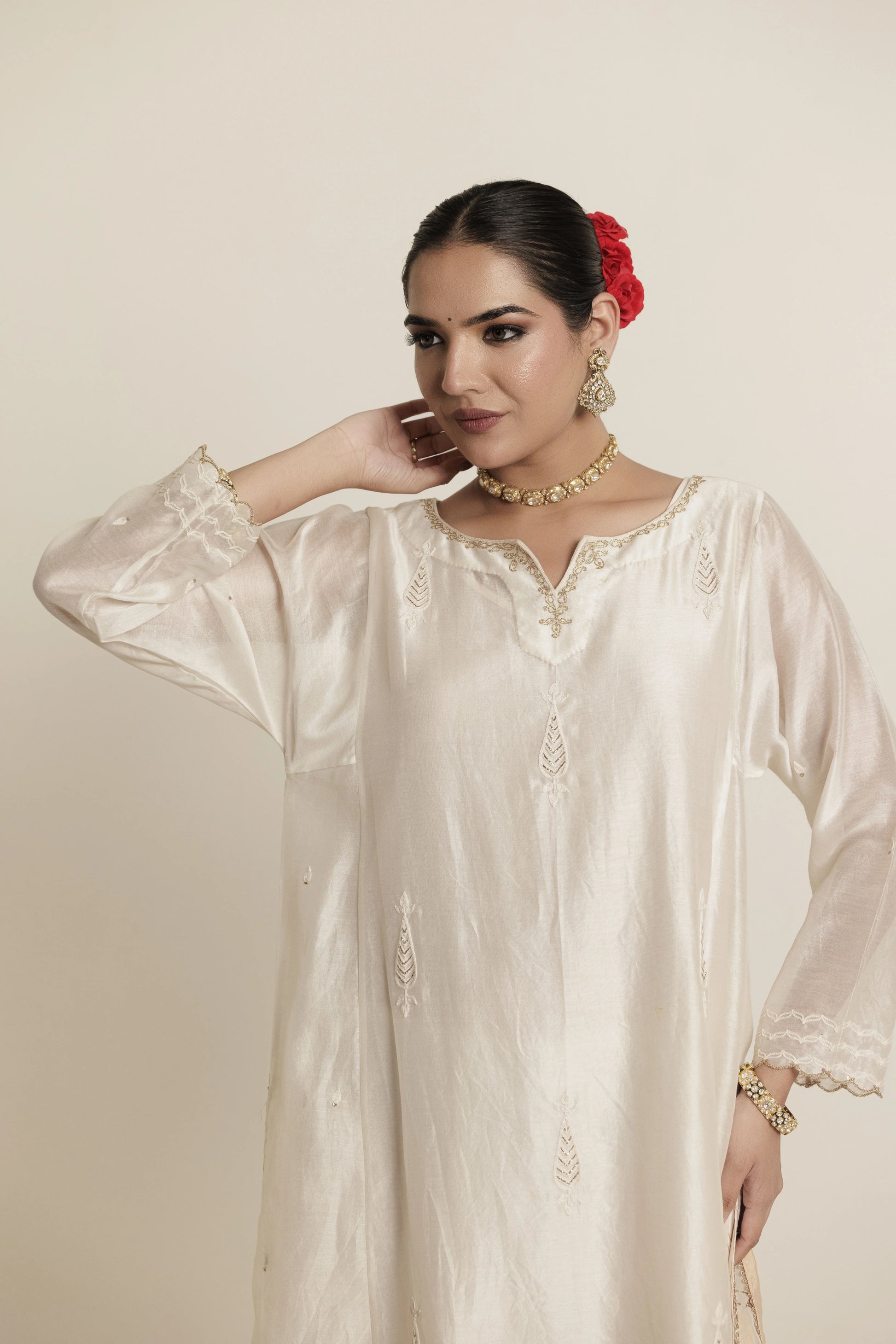 An Elegant Ivory Chanderi Kurta Set adorned with Zari detailing on the neck, sleeves and kurta making it an ideal statement piece for the upcoming festivities. The subtle shimmer of the embroidery highlights the richness of the design, perfect for making a statement at any occasion.