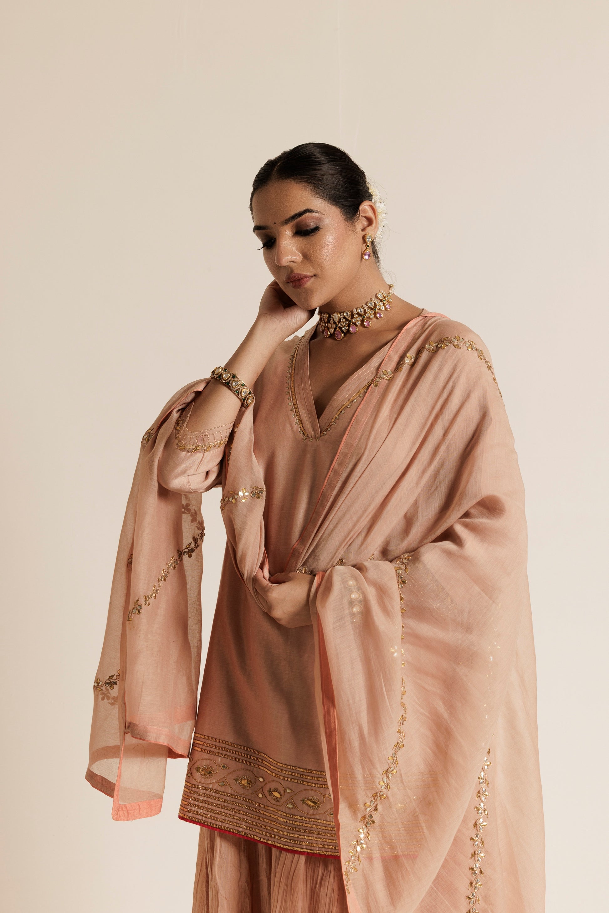 An Elegant Pale Pink Sharara Set featuring exquisite hand embroidery of Gota-patti, Aari & zardozi. The subtle shimmer of the embroidery highlights the richness of the design, perfect for making a statement at any occasion.