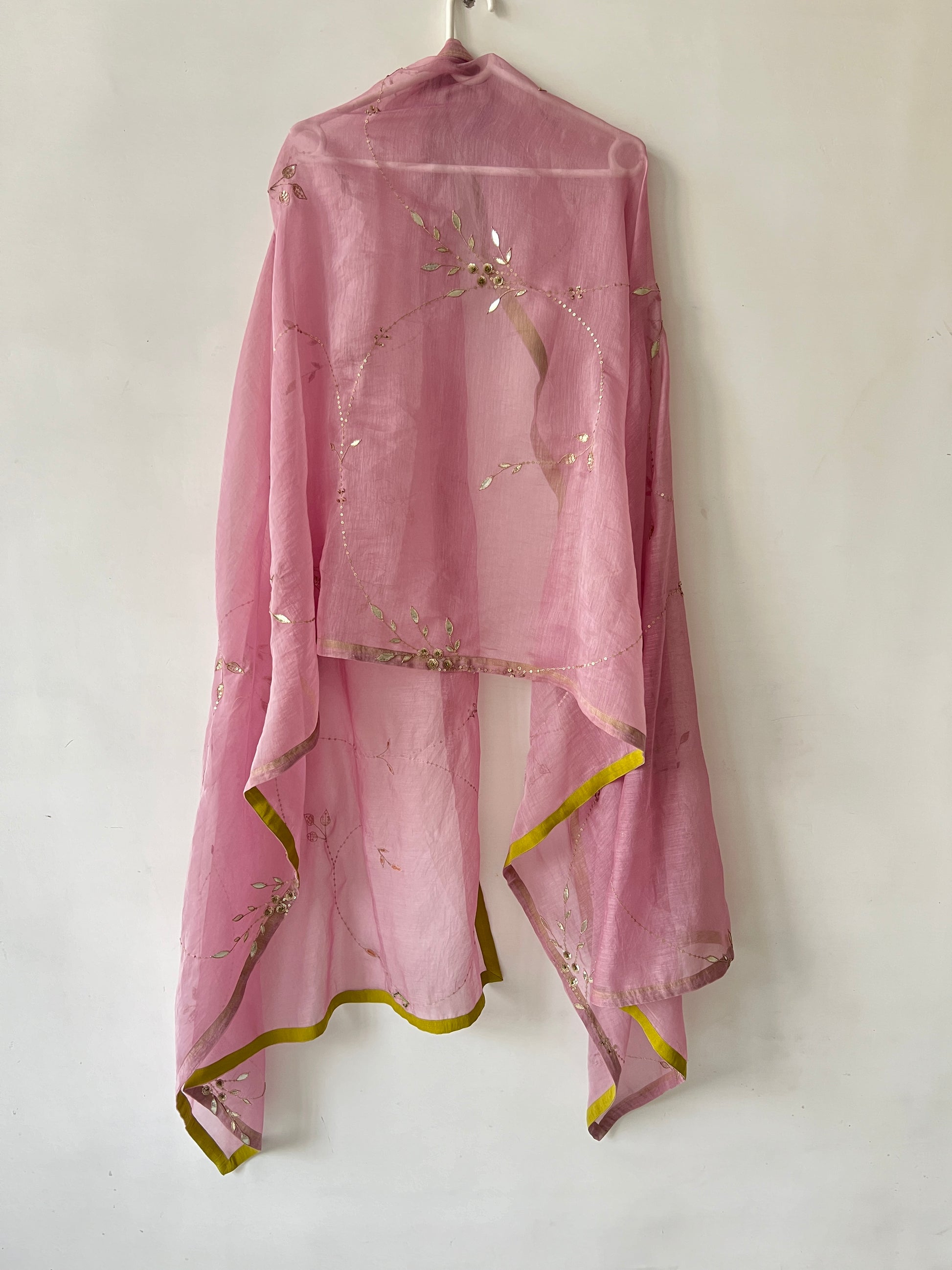This Lavender Pink & Mustard cotton silk dupatta with delicate gold gota, zardozi sequins embroidery, It has small gota flowers all over. Wrap around this astounding piece and grace your favourite occasion. The beautiful and intricate gota work showcases the precision and perfection with which the artisans have worked on this elegant beauty.