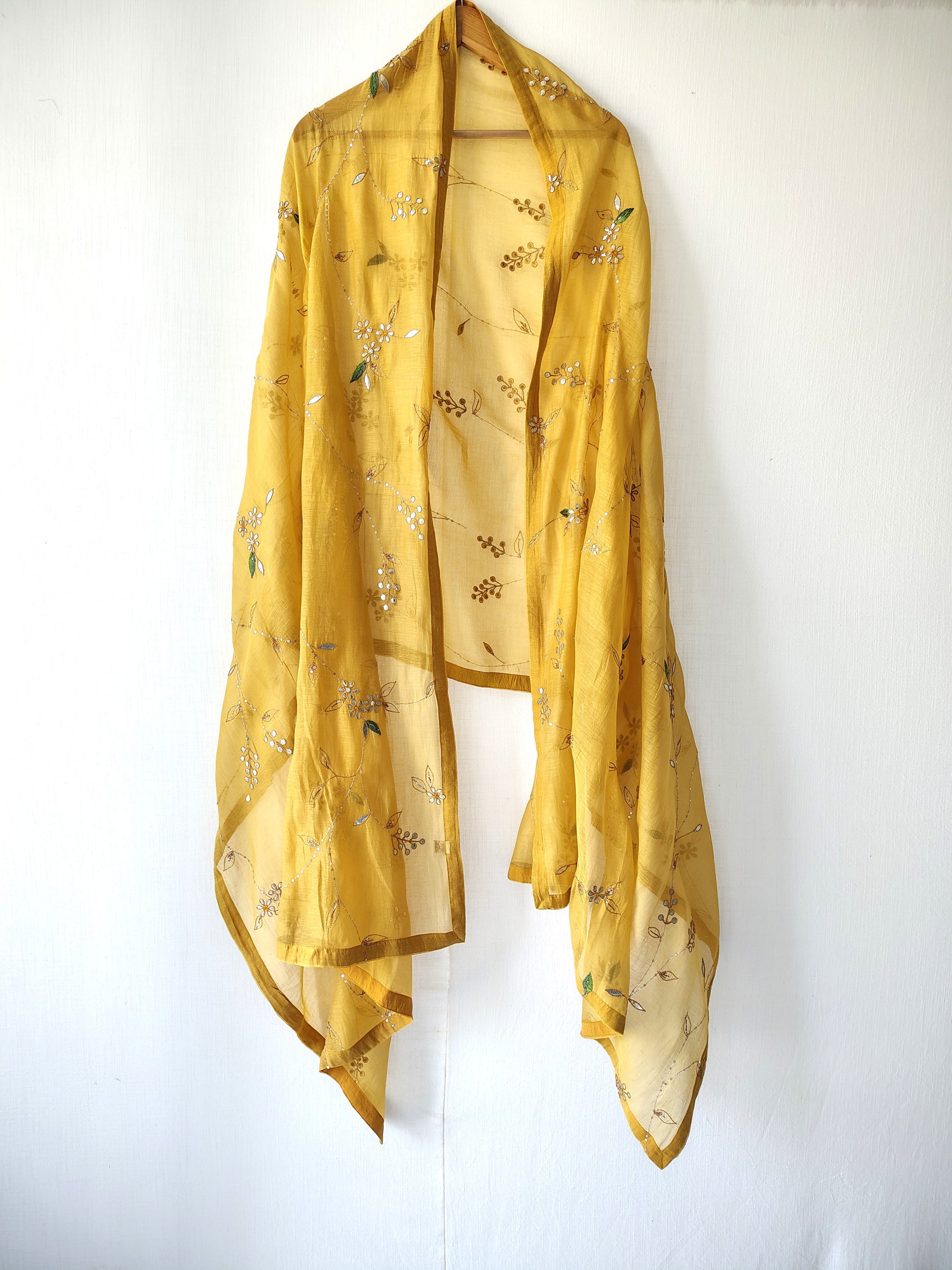 Hand Crafted cotton silk dupatta with delicate gota-patti, aari-zardozi embroidery finished with same colour facing. It has bit floral boota's all over., Wrap around this astounding piece and grace your favourite occasion. The beautiful and intricate gota-patti work showcases the precision and perfection with which the artisans have worked on this elegant beauty.