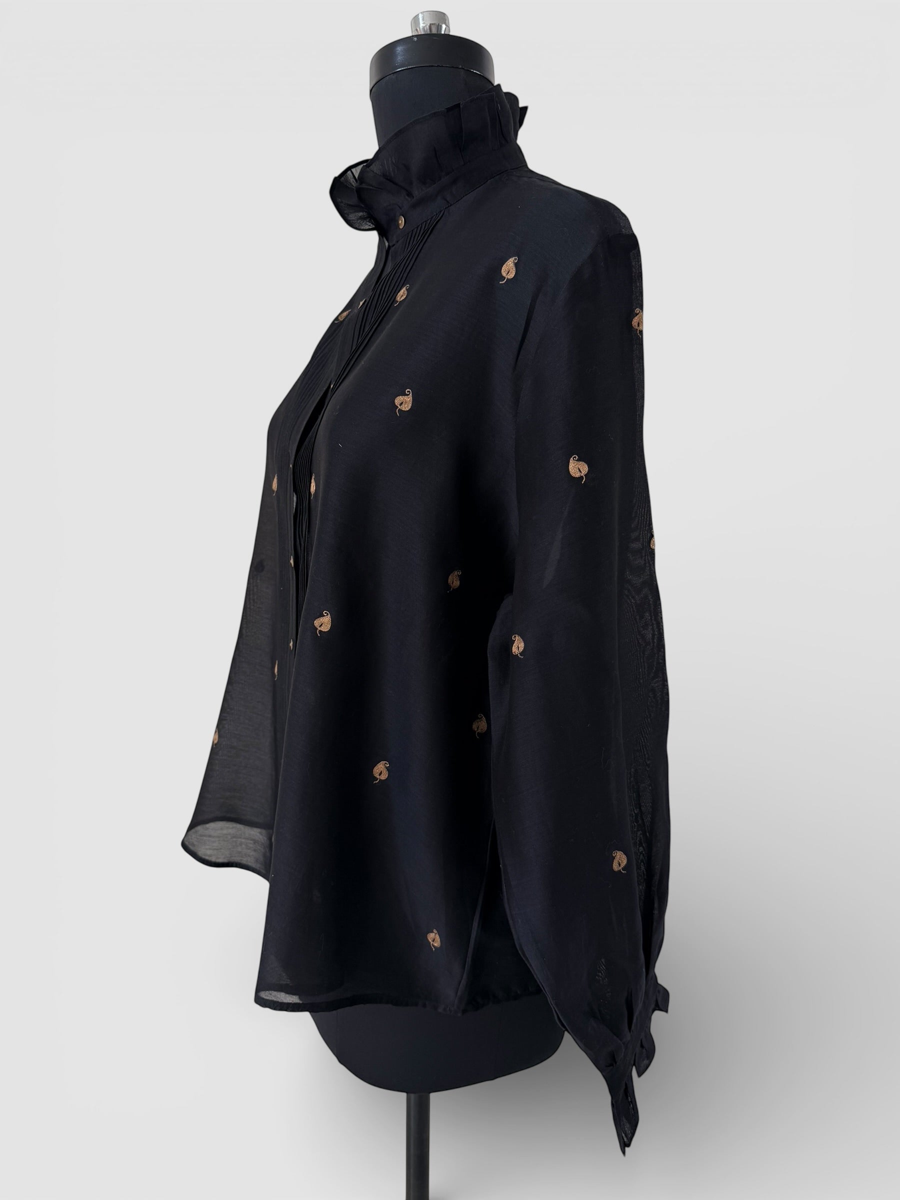A statement Relaxed Fit shirt in cotton-silk chanderi. Featuring muted Gold hand tambour embroidery on the front & back and sleeves, button down front with a quilted edge, ruffle collar and sleeve edge.