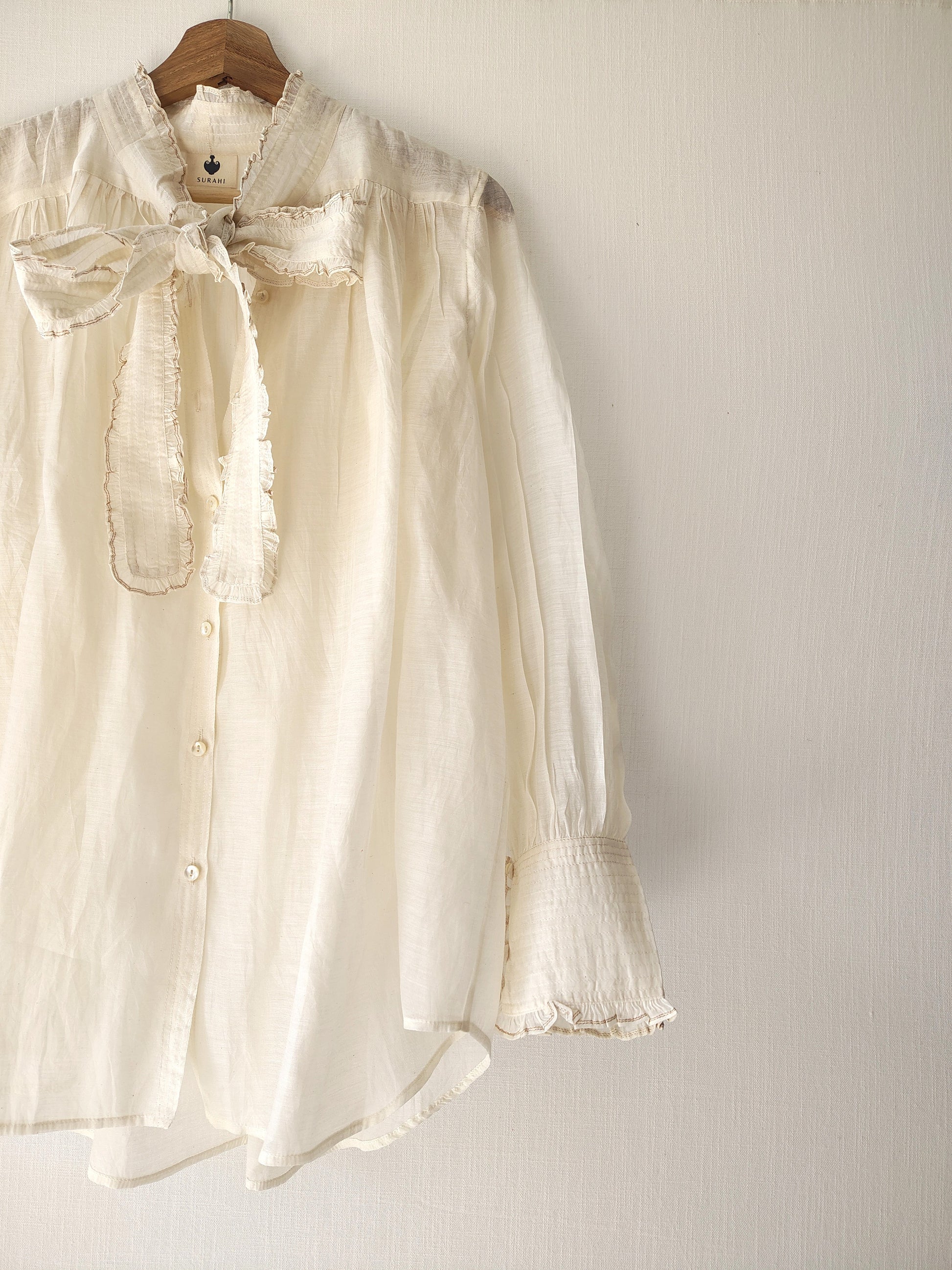 A Statement Sheer Frill Victorian Shirt in cotton-silk chanderi. This statement shirt can be worn tucked in with black pleated wide leg trousers and a gold buckle belt for a polished, uptown look.