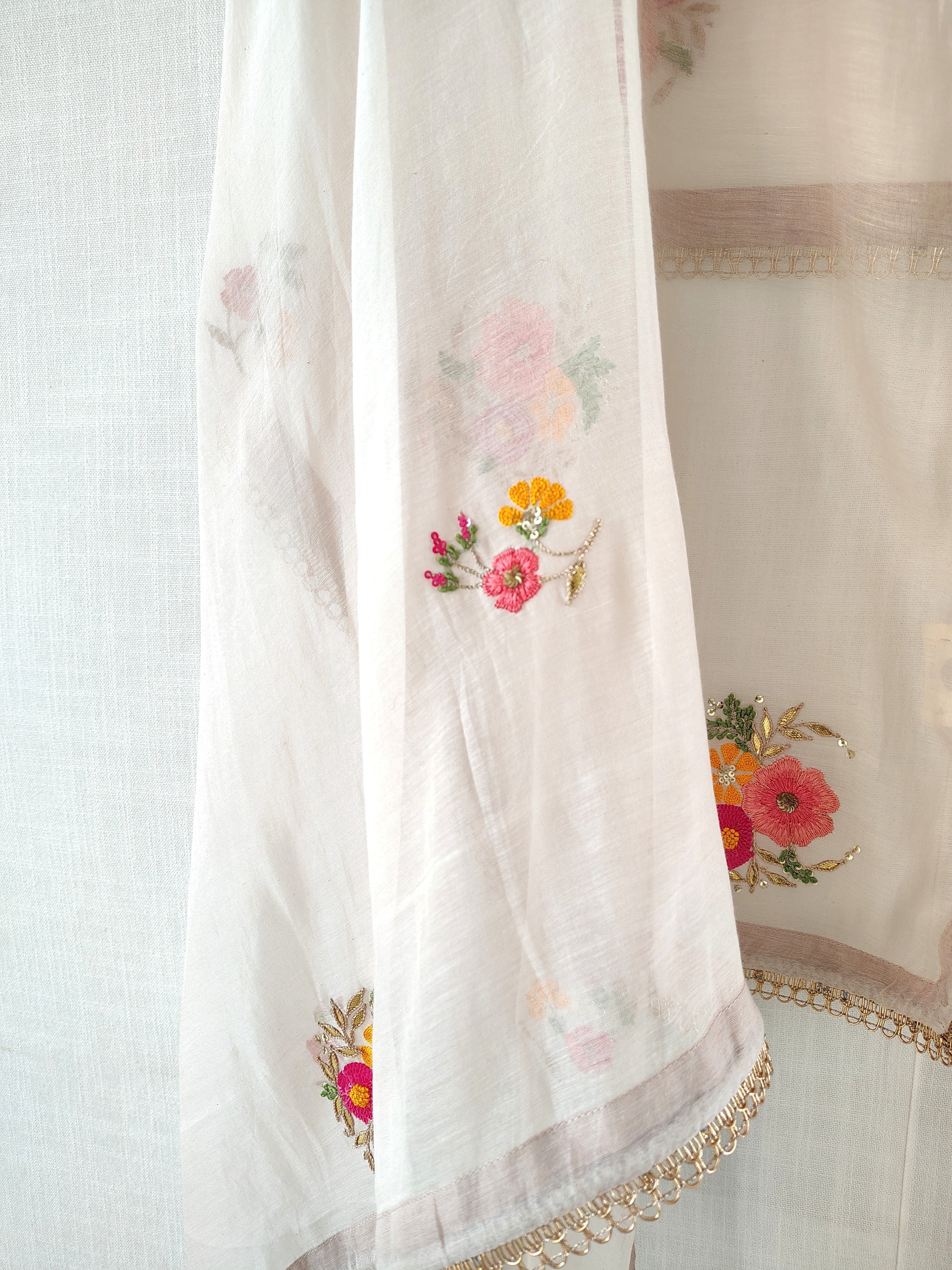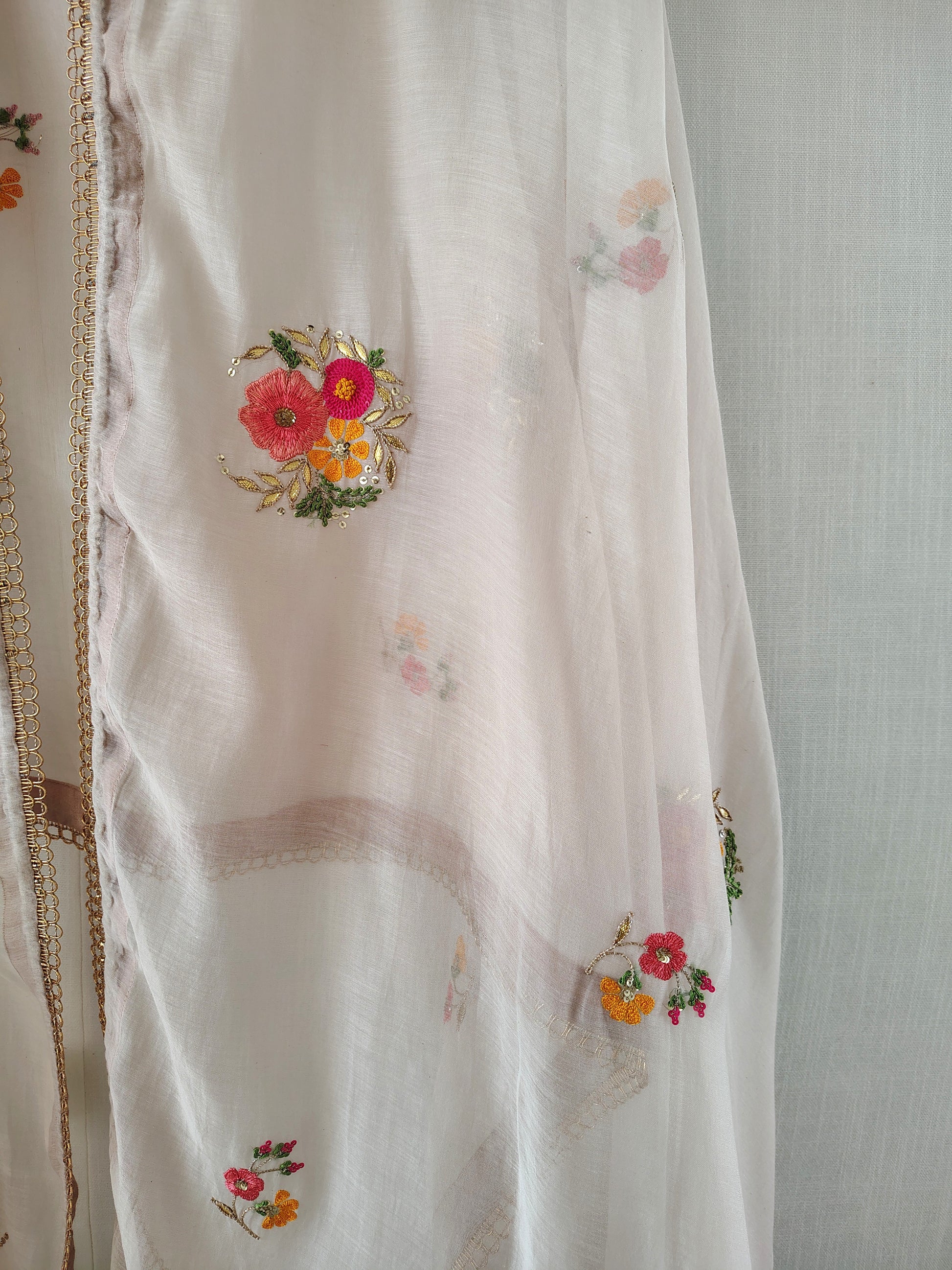 Hand Crafted White cotton silk dupatta with delicate gold zari, sequins and gota-patti embroidery, It has big floral boota all over. The dupatta is finished with a traditional gold zari lace border.